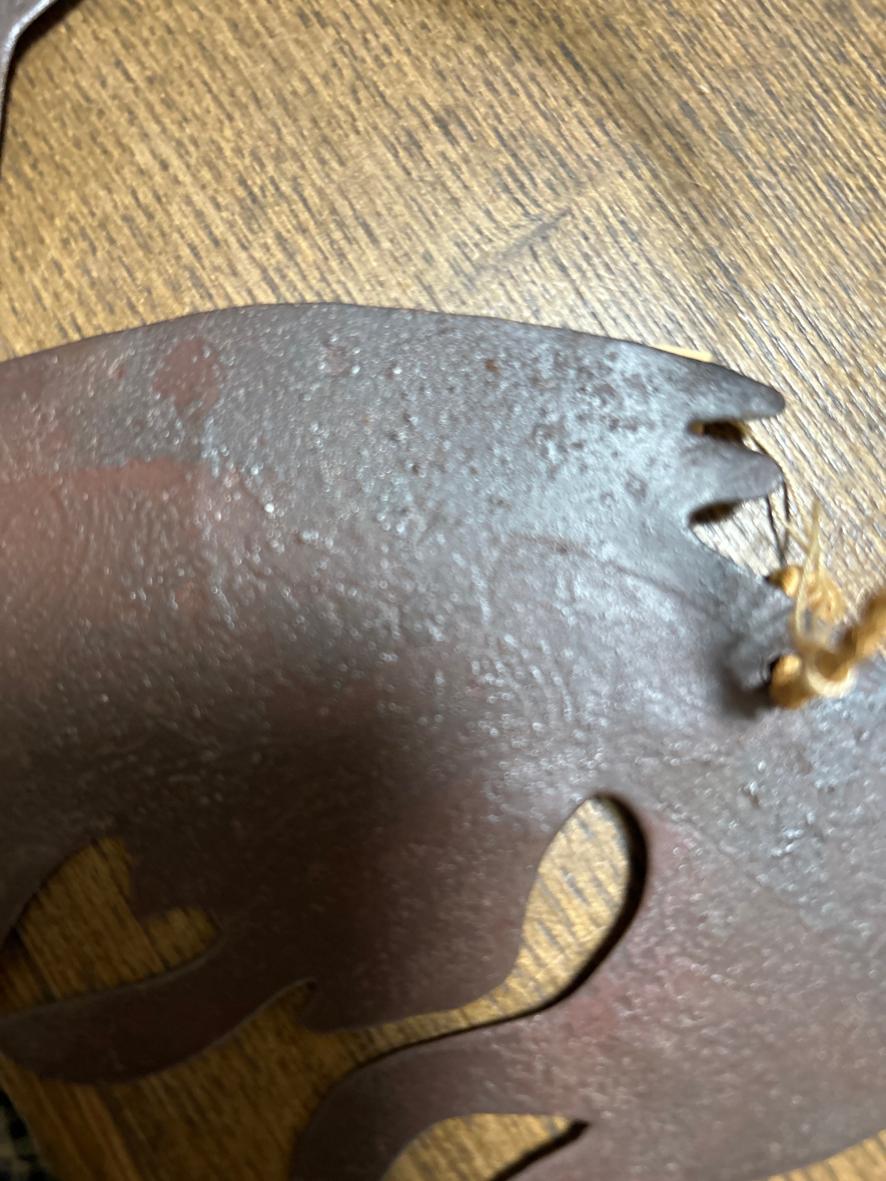 薄い鉄板で出来ています。色ムラやザラザラ凹みがありますが古さを出しているため、ご了承ください